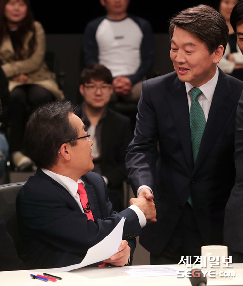 [포토] 토론회 시작전 악수하는 홍준표-안철수 입력 : 2017-04-25 23:38:48 수정 : 2017-04-25 23:38:47 구글 네이버 유튜브 홍준표 자유한국당 대선후보(왼쪽)와 안철수 국민의당 대선후보가 25일 경기도 고양시 빛마루 방송지원센터에서 열린 중앙일보- JTBC-한국정치학회 공동주최 2017 대통령 후보 초청 토론회 전 악수를 하고 있다. <고양 국회사진기자단=세계일보> Copyright ⓒ 세계일보. 무단 전재 및 재배포 금지 세계닷컴 한윤종