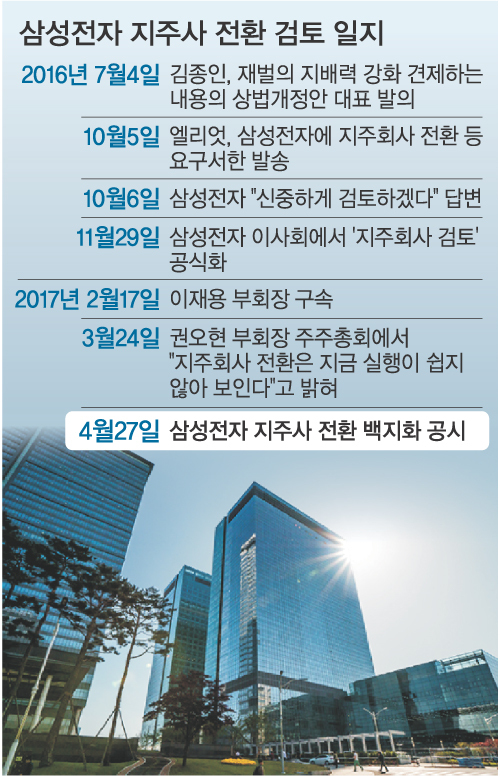삼성전자는 27일 이사회에서 지주회사로 전환하지 않기로 결정했다고 발표했다. 지난해 11월29일 열린 이사회에서 지주회사 전환 검토를 공식화한 지 5개월 만이다. 1분기 실적발표 후 열린 콘퍼런스콜에서 삼성전자는 “투자자들의 요청에 따라 법률, 세제, 회계 등 다양한 측면에서 지주회사 전환을 검토했다”며 “그 결과 사업경쟁력에 도움이 안 되고 경영 역량을 분산시킬 뿐 아니라 몇 가지 (부정적)이슈가 확인됐다”고 설명했다.