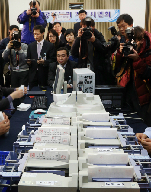중앙선거관리위원회 관계자들이 제18대 대선 개표부정 의혹과 관련해 2013년 1월 17일 오후 국회 지하 대강당에서 개표 과정을 공개 시연하며 투표지 분류작업을 하고 있다. 자료사진 |