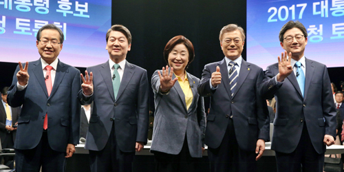 | 5개 주요 정당의 대선 후보들이 지난 25일 TV 토론회에 앞서 기념촬영을 하고 있다. 왼쪽부터 홍준표 자유한국당, 안철수 국민의당, 심상정 정의당, 문재인 더불어민주당, 유승민 바른정당 후보. |