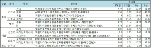 대신증권은 주식형 가운데 선진국에 투자하는 미래에셋인사이트증권투자신탁1(주식혼합)종류A 펀드를 추천했다. 미국 대상으로는 AB미국그로스증권투자신탁(주식-재간접형)종류형A, 유럽은 피델리티유럽증권자투자신탁(주식-재간접형)A를 유망펀드로 지정했다. 선진국 대상 세 펀드는 1년 수익률이 10~14% 수준을 보였다.