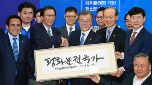 | 자치분권 국민협약식 더불어민주당 문재인 후보(앞줄 왼쪽 세번째)가 27일 여의도 당사에서 열린 ‘전국이 골고루 잘사는 대한민국’ 자치분권정책 발표 및 지방분권 개헌 국민협약식에서 지방분권개헌국민회의 대표단으로부터 액자를 선물받고 있다. 남정탁 기자 |