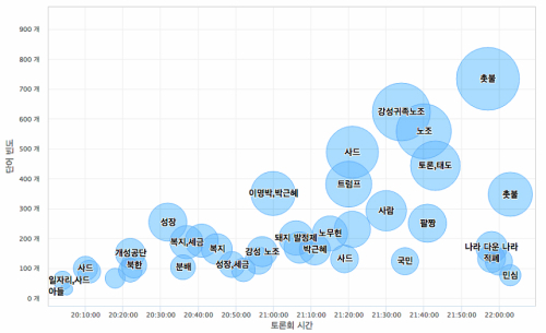 누리꾼의 댓글 중 가장 많이 쓰인 단어는 ‘촛불’이었다. 촛불은 토론회 막바지인 오후 9시 50분쯤부터 800회 이상 댓글에 언급됐다. 더불어민주당 문재인 후보가 “우리는 지난 겨우내 추운 광장에서 촛불을 들면서 나라다운 나라를 만들자고 외쳤다”면서 촛불민심을 강조한 결과로 보인다.