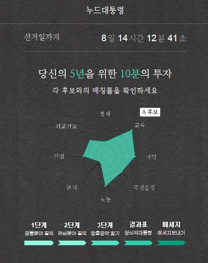 | 유권자들이 대통령 선거 후보들과의 매칭률을 확인할 수 있는 서비스를 제공하는 웹사이트 ‘누드대통령’의 홈페이지 화면. 누드대통령 캡처 |