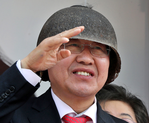 | 녹슨 철모 쓴 채 경례 자유한국당 홍준표 후보가 30일 오전 경기도 연천군 전곡읍 버스터미널 앞에서 열린 유세현장에서 지지자들이 전달해준 녹슨 철모를 쓴 채 경례하고 있다. 연천=연합뉴스 |