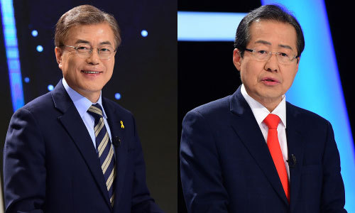 | 문재인 더불어민주당, 홍준표 자유한국당 대선 후보(왼쪽부터)가 2일 오후 서울 상암동 MBC 스튜디오에서 열린 중앙선거방송토론위원회 주관 초청대상 3차 후보자토론회에 참석해 발언하고 있다. 청와대 사진기자단 |