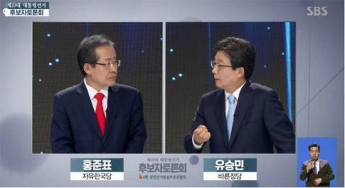 지난 2일, 대선후보 TV토론에서 자유한국당의 홍준표 후보와 바른정당의 유승민 후보가 바른정당 의원들의 집단탈당 사태를 두고 설전을 벌였다.