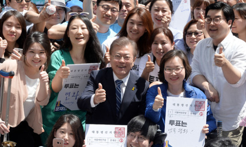 | 엄지 든 文 더불어민주당 문재인 후보(가운데)가 3일 오전 서울 여의도 당사에서 사전투표를 독려하는 행사에 참석해 기호 1번을 뜻하는 엄지를 치켜올리고 있다. 하상윤 기자 |