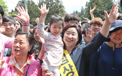 정의당 심상정 후보(가운데)가 4일 오전 제주대학교 정문 앞에서 유세를 마친 뒤 어린아이를 안고 환호하는 지지자들에게 손을 흔들며 인사하고 있다. 제주=연합뉴스 |