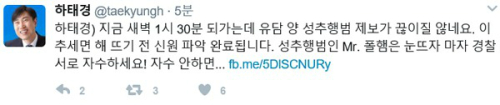 하태경 의원은 5일 자신의 트위터에 “지금 새벽 1시 30분 되가는데 유담 양 성추행범 제보가 끊이질 않네요. 이 추세면 해 뜨기 전 신원 파악 완료됩니다. 성추행범인 Mr. 폴햄은 눈뜨자마자 경찰서로 자수하세요! 자수 안하면...”이라는 글을 게시했다.
