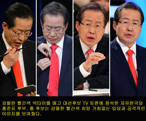 19대 대통령 선거가 2일 앞으로 다가온 가운데 대선 후보자들은 유권자의 마음을 사로잡기 위해 TV 토론 및 유세 연설 현장에서 소품 등을 통해 자신의 정당 색깔을 노출한다. 남성 후보는 주로 넥타이를 활용하고, 여성 후보는 재킷이나 셔츠를 활용한다. 그런데 왜 홍준표 자유한국당 대선후보는 '빨간색 넥타이' 만 고집할까요?