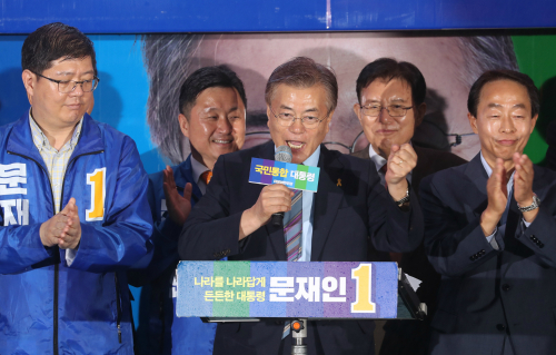 | 더불어민주당 문재인 대선후보가 지난 5일 오후 부산광역시 중구 남포동에서 열린 집중유세에서 김대중 전 대통령의 삼남 김홍걸 민주당 국민통합 위원장(왼쪽), 김영삼 전 대통령의 차남 김현철 국민대 교수(오른쪽)와 함께 지지를 호소하고 있다. 연합뉴스 |