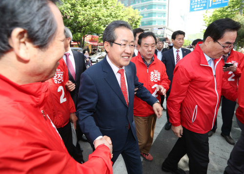 | 자유한국당 홍준표 대선후보가 6일 오전 경기도 고양시 일산문화공원에서 당원들과 인사하고 있다. 연합뉴스 |