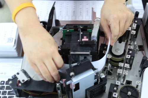 | 투표지 분류기 내부 스캐너의 모습. 투표용지가 스캐너를 통과하면 분류기는 즉시 스캔해 전자문서 형태로 저장하는 동시에 기호별로 분류한다. |