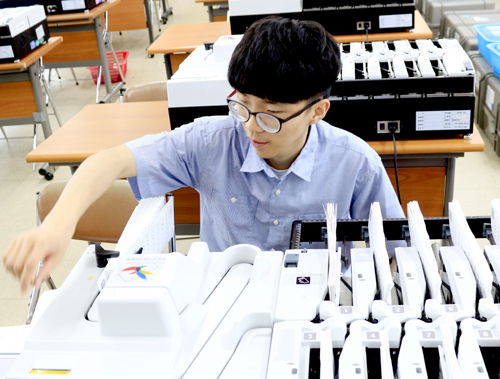 | 19대 대선 개표요원인 대학생 정해준(22)씨가 투표지 분류기 운용 연습을 하고 있다. |