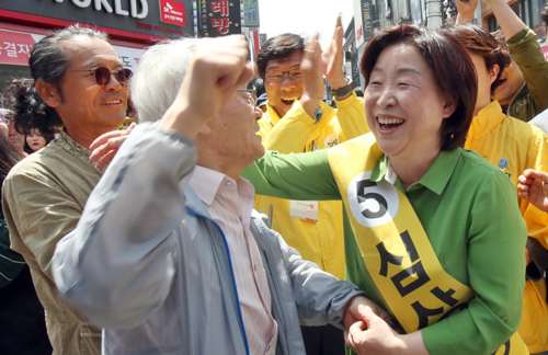 | 시민과 한 컷 정의당 심상정 후보(오른쪽)가 7일 오후 경기도 의정부시 유세에서 시민들의 환호에 답하고 있다. 의정부=연합뉴스 |