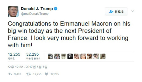 트럼프 대통령은 이날 자신의 트위터에 “에마뉘엘 마크롱이 차기 프랑스 대통령으로서 대승을 거둔 것을 축하한다.”라며 “그와 함께 일하게 돼 무척 기쁘다”라고 말했다.
