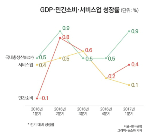 때문에 민간소비와 직결되는 서비스업은 특히 부진을 면치 못하고 있다. 전기 대비 서비스업 성장률은 지난해 1분기 0.4%에서 2분기 0.5%, 3분기 0.6%로 조금씩이나마 증가했지만 4분기 들어 다시 하락 반전했다. 지난해 4분기 0.2%에 이어 올해 1분기 0.1%를 기록, 극도로 부진한 상태다.