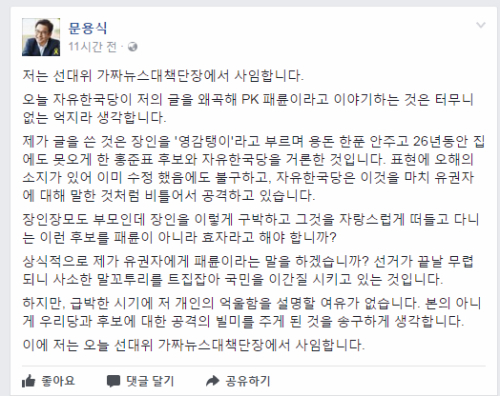이같은 논란이 불거지자 문 단장은 7일 11시30분쯤 자신의 페이스북에 글을 올려 “본의 아니게 우리 당과 후보에 대한 공격의 빌미를 주게 된 것을 송구스럽게 생각한다”며 사임 의사를 밝혔다. 그는 이 글에서 “한국당이 제 글을 왜곡한 것은 터무니없는 억지”라며 “제가 글을 쓴 것은 장인을 ‘영감탱이’라고 부르며 용돈 한 푼 안 주고 26년간 집에도 못 오게 한 홍 후보를 거론한 것”이라고 설명했다.