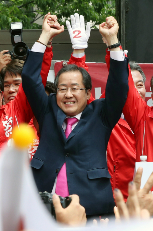 홍 후보는 오전 부산 해운대 한 호텔에서 “위대한 국민이 위대한 대한민국을 만듭니다”는 주제의 대국민 기자회견으로 공식 일정을 시작했다. 홍 후보는 회견에서 “좌파가 무너뜨린 자유대한민국의 기초를 다시 세우겠다”며 “내일 대역전의 기적을 완성하겠다”고 다짐했다. 친북세력·민주노총·전교조를 막을 수 있는 후보는 자기임을 강조하며 보수층 유권자 표심을 파고들었다.