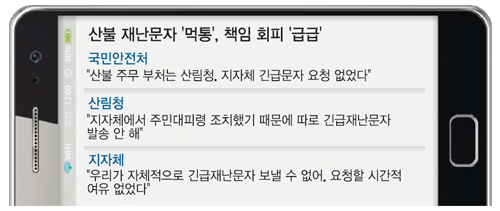 국가재난상황 발생 시 컨트롤타워 역할을 하는 국민안전처의 이런 책임 회피를 놓고 논란은 커지고 있다. 비난여론을 의식한 듯 안전처는 이날 강릉지역에 산불이 다시 번지자 오전 3시29분과 오전 10시2분 긴급 재난문자를 발송했다. 안전처는 2014년 4월 세월호 참사 발생 이후 국가재난을 총지휘할 컨트롤타워가 없다는 지적에 따라 신설된 부처다.