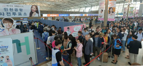 | 제19대 대통령 선거 사전투표 첫날인 4일 오전 서울역에 마련된 남영동 사전투표소에서 시민들이 투표하기 위해 길게 줄을 서서 기다리고 있다. 세계일보 자료사진 |