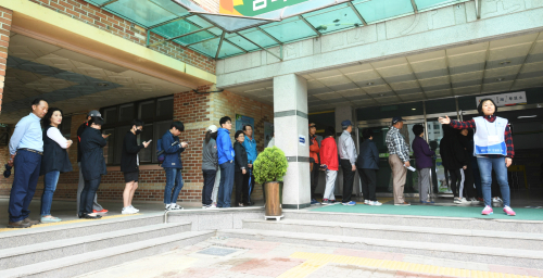 | 제19대 대통령 선거일인 9일 오후 경기도 수원시 장안구 송원초등학교에 마련된 투표소에서 유권자들이 길게 줄을 서 있다. 사진=연합 |