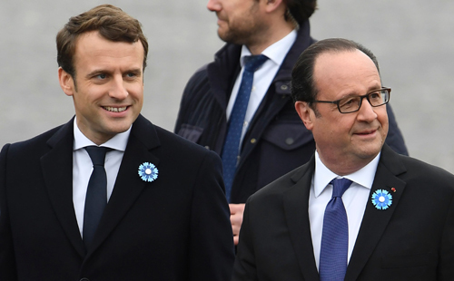 | 올랑드와 첫 공식 일정 에마뉘엘 마크롱 프랑스 대통령 당선자(왼쪽)가 8일(현지시간) 프랑수아 올랑드 대통령과 함께 파리 개선문에서 열린 2차대전 참전용사 추모행사에 참석하고 있다. 이 행사 참여는 마크롱 당선자의 첫 공식 일정이다. 파리=AFP연합뉴스 |