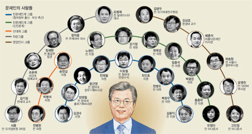 문재인 대통령 당선자는 매머드급 인재풀을 자랑한다. 정권교체의 열망이 문 당선자에게 쏠리면서 그의 싱크탱크인 ‘정책공간 국민성장’에만 1000여명의 전문가가 포진해 있다. 6년 전 정치를 시작했을 때만 해도 노무현정부 청와대에서 함께 손발을 맞췄던 소수의 측근 그룹이 그를 보좌했으나 제1야당 대선후보와 당대표를 거치며 당내 친문(친문재인)계 인맥도 대단히 두꺼워졌다. 대통령직인수위원회 없이 곧바로 대통령 임기를 시작해야 하는 초유의 상황인 만큼 이들 인사들이 청와대 비서실과 내각의 중책을 맡을 가능성이 높다는 관측이다.
