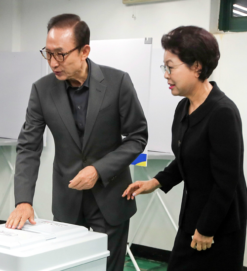 | 이명박 전 대통령(왼쪽)과 부인 김윤옥 여사가 9일 오전 서울 강남구 논현아파트에 마련된 논현1동 제3투표소를 찾아 한 표를 행사하고 있다. 연합뉴스 |