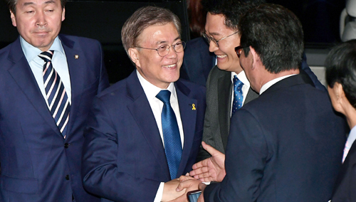 | 더불어민주당 문재인 후보(왼쪽 두 번째)가 9일 오후 국회 의원회관으로 들어서며 선대위 관계자들과 악수하며 환하게 웃고 있다. 이재문 기자 |
