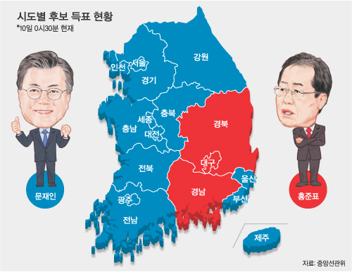 세계일보가 9일 오후 11시15분 현재 개표현황을 분석한 결과(전국 득표율 21.2%) 문 당선자는 전국 17개 시도 중 대구, 경북, 경남을 제외한 14개 시도에서 1위를 달리는 것으로 나타났다. 전통적으로 민주당 계열 후보에게 승리를 안겨주었던 호남 3개 시도(광주·전북·전남)는 물론 고향 부산과 울산에서도 1위를 달렸다. 영남과 호남에서 골고루 지지를 받는 대통령이 탄생한 것이다.