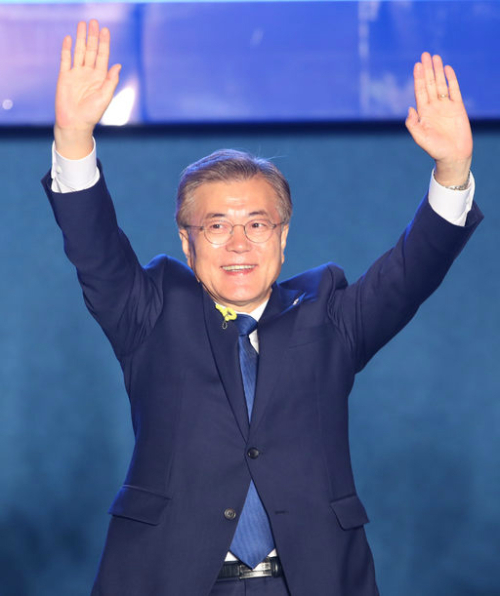 | 문재인 대통령 당선자가 9일 밤 서울 광화문광장에서 환호하는 시민들에게 손들어 인사하고 있다. 이제원기자 |