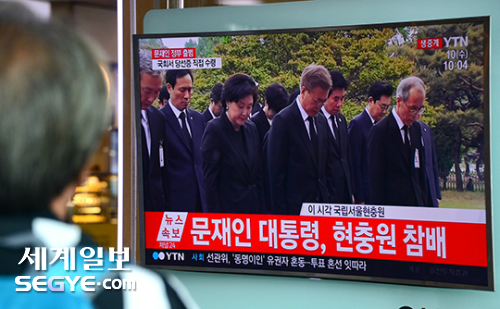 '문재인 대통령 현충원 참배' 입력 : 2017-05-10 10:32:57 수정 : 2017-05-10 10:42:14 구글 네이버 유튜브 19대 대선일이 하루가 지난 10일 오전 서울 용산구 서울역 대합실에서 시민들이 국립현충원을 찾아 참배하는 문재인 19대 대통령 당선인의 모습을 지켜보고 있다. 김경호 기자 stillcut@segye.com Copyright ⓒ 세계일보. 무단 전재 및 재배포 금지 세계닷컴 김경호