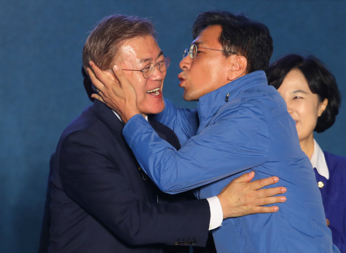 화제의 ‘키스’ 장면은 이렇게 시작됐다. 이날 무대에 먼저 올라온 안 지사가 당선이 확실해진 문 대통령을 맞이하면서 "축하한다"며 활짝 웃는 모습으로 얼굴 왼쪽 볼에 키스했다. 안 지사는 문 대통령에게 다가가 악수를 청하며 축하 인사를 건넨 뒤 얼굴을 끌어당기는 격렬한(?) 키스로 격한 기쁨을 표시했다.