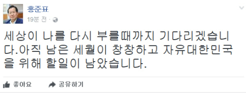 홍 전 후보는 10일 오후 1시쯤 자신의 페이스북에 "아직 남은 세월이 창창하고 자유대한민국을 위해 할일이 남았습니다"며 이같은 글을 올렸다.