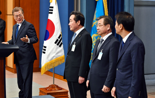| 문재인 대통령이 10일 오후 청와대 춘추관 브리핑룸에서 열린 기자회견에서 이낙연 국무총리(문 대통령 오른쪽부터)와 서훈 국정원장, 임종석 비서실장 후보자를 발표하고 있다. 서상배 선임기자 |