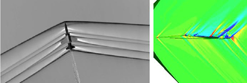 | 실제 초음속 비행에서 발생하는 충격파의 모습(왼쪽)과 소닉붐(초음속 비행기가 내는 큰 소음)을 최소화한 초음속 비행기의 컴퓨터 시뮬레이션. 출처=미국항공우주국 |