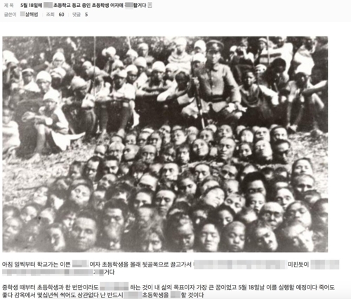 '○살해범'이라는 아이디를 쓰는 한 누리꾼은 "이달 18일 아침 일찍 학교에 가는 초등학생을 끌고 가 성폭행하겠다"며 "죽어도 좋고 감옥에서 몇십 년씩 썩어도 상관없다"고 적었다.