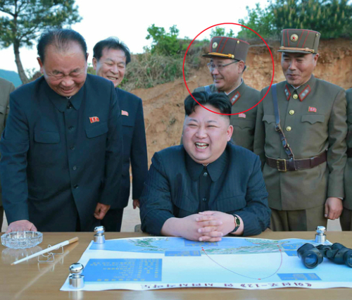 | 모습 드러낸 北 미사일 개발 주역 김정식 김정은 노동당 위원장(가운데)이 14일 화성-12 신형 중장거리 탄도미사일 발사가 성공하자 간부들과 함께 웃는 장면 뒤로 북한 미사일 개발의 일등공신으로 꼽히는 김정식 당 군수공업부 부부장(붉은 원)이 중장(별 2개) 계급장을 단 군복을 입고 등장한 사진을 노동신문이 15일 공개했다. 김정식이 군복을 입은 모습으로 나타난 것은 이번이 처음이고, 김정식 옆에서 중장 군복을 입은 미사일 전문가 장창하는 당 중앙위 책임일꾼이라고 소개돼 국방과학원장 자리에서 퇴진했다는 분석이 나오고 있다. 연합뉴스 |