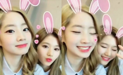 공개된 영상 속 사나와 다현은 어플을 이용해 토끼 모션스티커를 자신들의 얼굴에 합성했다.