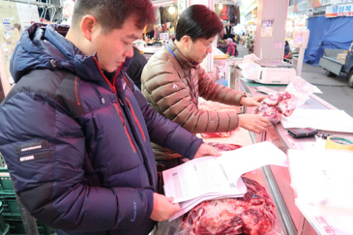 | 국립농산물품질관리원 특별사법경찰관들이 한 전통시장 정육점에서 돼지고기 원산지표시 위반 여부를 점검하고 있다. 국립농산물품질관리원 제공 |