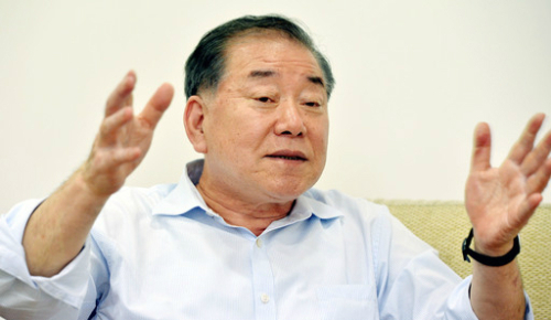 | 문정인 통일외교안보특보가 23일 서울 종로구 동아시아재단 사무실에서 가진 단독 인터뷰에서 주요 현안에 대한 입장을 밝히고 있다. 하상윤 기자 |