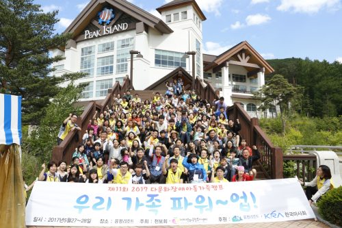 | 다문화가정 장애아동 가족캠프 참가자들이 용평리조트 내 피크 아일랜드 입구에서 기념촬영을 하고 있는 모습. |