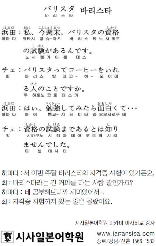 [시사일본어학원의 초단기 일본어 회화] 바리스타 입력 : 2017-05-30 19:37:58 수정 : 2017-05-30 19:37:58 구글 네이버 유튜브 Copyright ⓒ 세계일보. 무단 전재 및 재배포 금지 세계일보 조선미