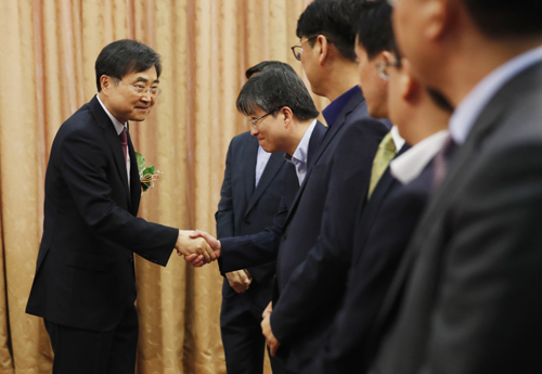 | 조현 신임 외교부 2차관(왼쪽)이 2일 오전 서울 종로구 외교부 청사에서 열린 취임식을 마치고 직원들과 인사하고 있다. |