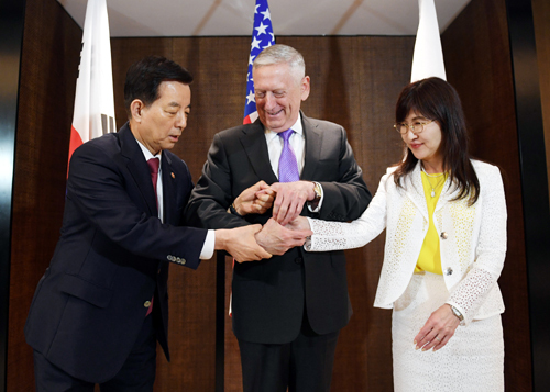 | 손은 잡았지만… 한민구 국방부 장관, 제임스 매티스 미국 국방부 장관, 이나다 도모미 일본 방위상(왼쪽부터)이 3일 싱가포르에서 열린 한·미·일 국방장관 회담에서 취재진에게 포즈를 취하기 위해 손잡고 있다. 미·일 국방장관에 비해 사드 보고 누락 파문을 겪고 있는 한 장관의 표정이 다소 경색되어 있다. 국방부 제공 |