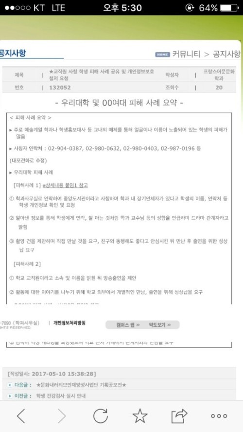 해당 대학은 재학생들의 피해가 이어지자 온라인 커뮤니티 게시판에 ‘교직원 사칭 피해 사례 공유 및 개인정보보호 철저 요청’이라는 제목으로 공지글을 올린 상태다.