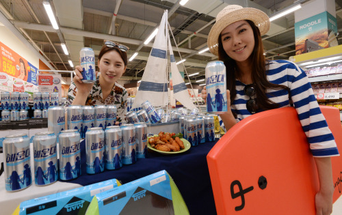 7일 오전 서울 등촌동 홈플러스 강서점에서 모델들이 전국 홈플러스 142개 매장에서 판매하는 '코리아 크래프트 브류어리'가 제조한 '해운대 맥주'를 선보이고 있다. '해운대 맥주'는 부산 해운대의 지명을 모티브로 만든 지역맥주로 대낮에 마셔도 부담이 없도록 쓴맛과 알코올 도수를 조정해 간편하게 즐길 수 있게 제조한 수제맥주다.