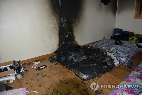 당시 강씨가 바로 양동이에 물을 담아 진화하면서 불이 번지지는 않았으나 방 내부 매트리스와 담요, 벽지 등이 타 소방서 추산 77만원 상당의 재산피해가 났다.